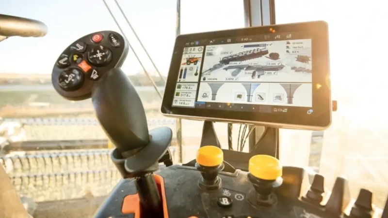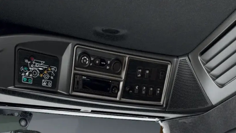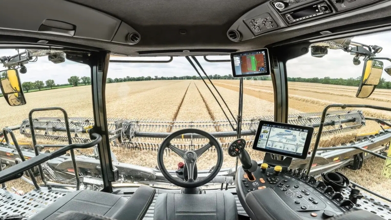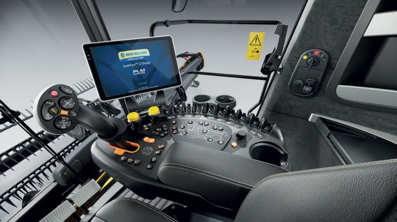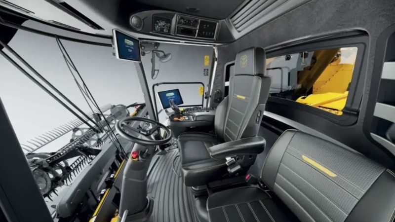Kabína Harvest Suite Ultra poskytuje ergonomické ovládanie a komfort aj počas dlhých pracovných dní. Dva dotykové displeje IntelliView 12 umožňujú prehľadné ovládanie funkcií stroja, mapovanie výnosu a nastavenie automatizovaných systémov. Moderný dizajn s bočnými panelmi a vizuálne signalizuje technologickú inováciu a modernú architektúru kombajnu.